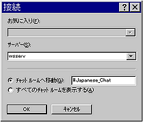 接続先のサーバ・チャットルームを指定するダイアログが開く。接続先サーバが wsserv でチャットルームが #Japanese_Chat になっていることを確認し、[OK]ボタンを押す。